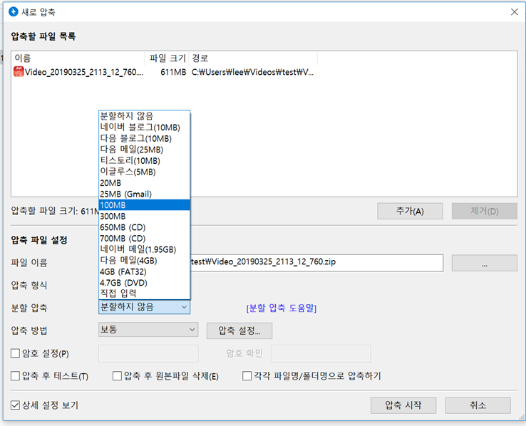 저는 미리 체크를 해놓았는데요. 해당 항목을 체크해야 분할압축을 할 수 있는 옵션이 등장합니다. 상세 설정 보기를 체크하면 저처럼 분할압축을 할 수 있는 화면이 나오고 분할 압축 용량을 직접 입력하거나 보기에 나와있는 용량을 선택할 수 있습니다. 저는 100MB로 분할 압축하고 싶어서 100MB를 선택했습니다. 선택이 끝난 후에 압축 시작을 누르면 압축이 진행됩니다.