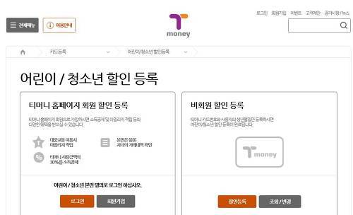 그러면 티머니 청소년등록을 할 수 있는 화면이 나옵니다. 티머니 홈페이지 회원 할인 등록과 비회원 할인 등록이 있습니다. 혜택은 티머니 홈페이지 회원 할인 등록이 더 많은 것 같습니다. 둘 중에 한 가지 방식을 선택하여 티머니 청소년등록을 하시면 됩니다.