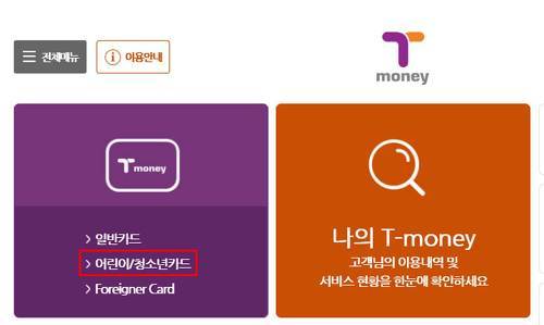 티머니 청소년등록을 위해 보라색 네모 상자 위에 마우스 커서를 올려 두면, 위와 같이 화면이 바뀔 것입니다. 여기에서 어린이/청소년카드를 클릭합니다.